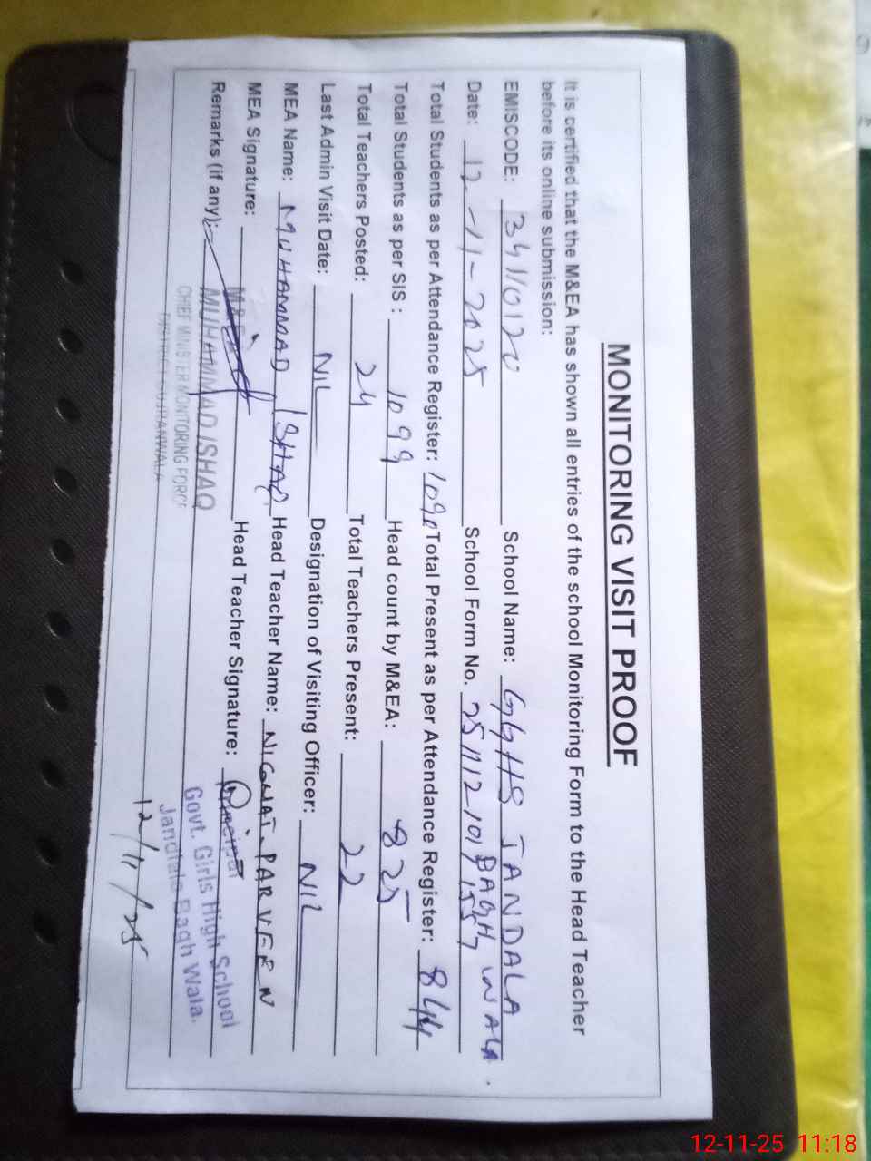 | EMIS Code: 34110120 | Name of School: GGHS JANDIALA BAGH WALA | |||