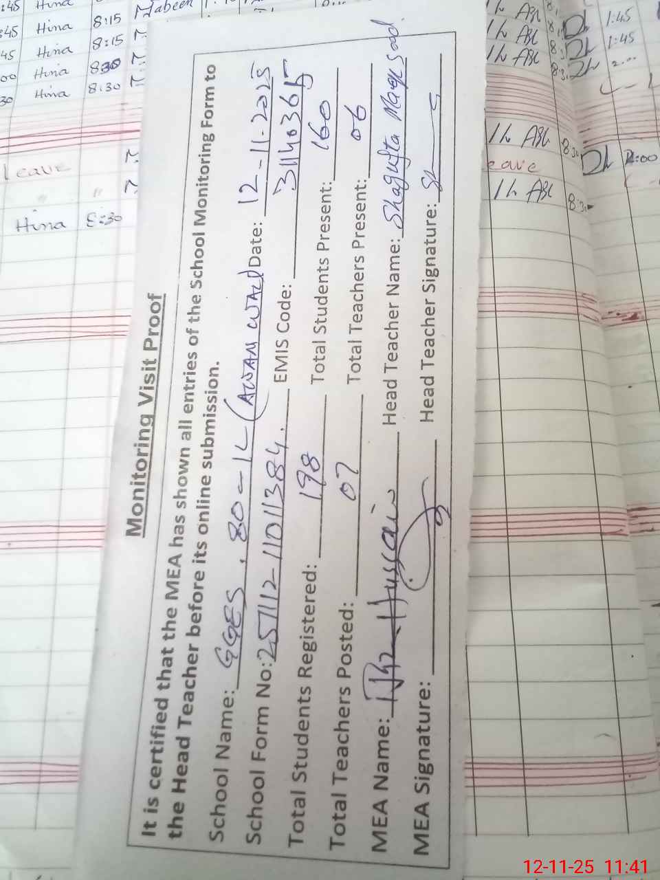 | Attendance Register | Head Teacher | MEA with School | Visit Proof |