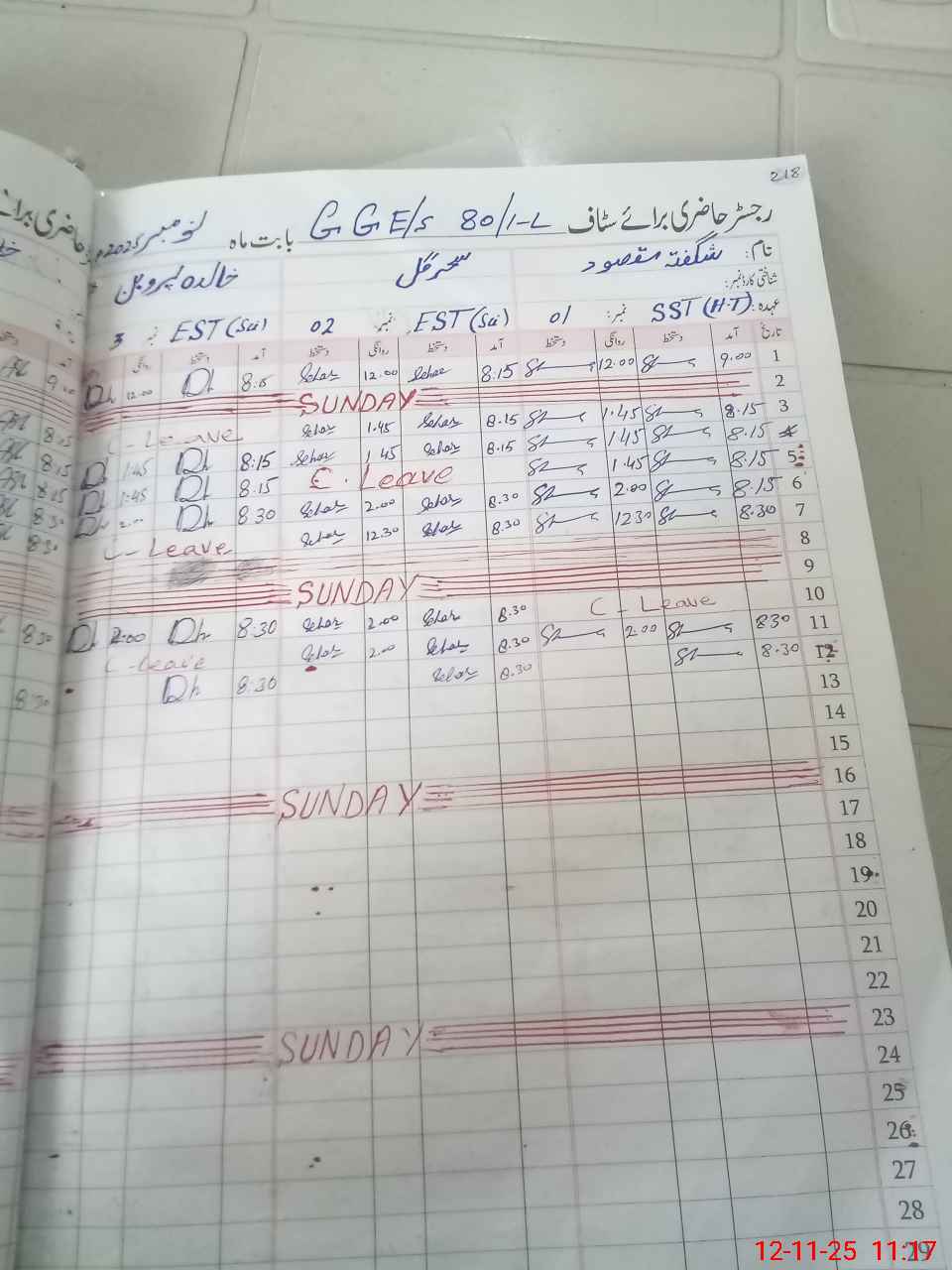| CNIC | Full Name | Designation | R/C | Absence During Last Calender Month |