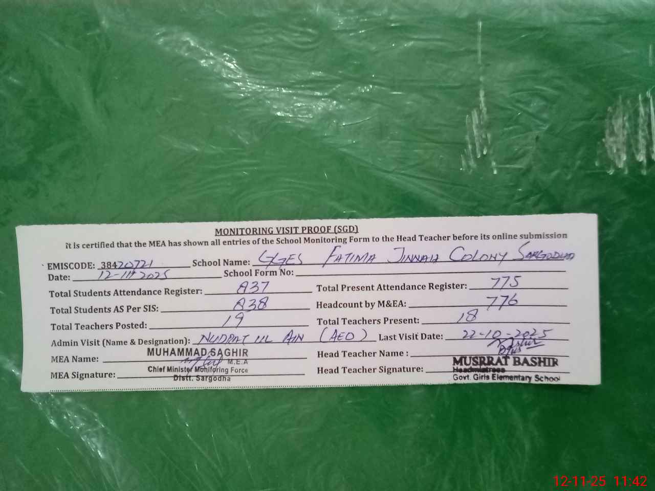 | Attendance Register | Head Teacher | MEA with School | Visit Proof |