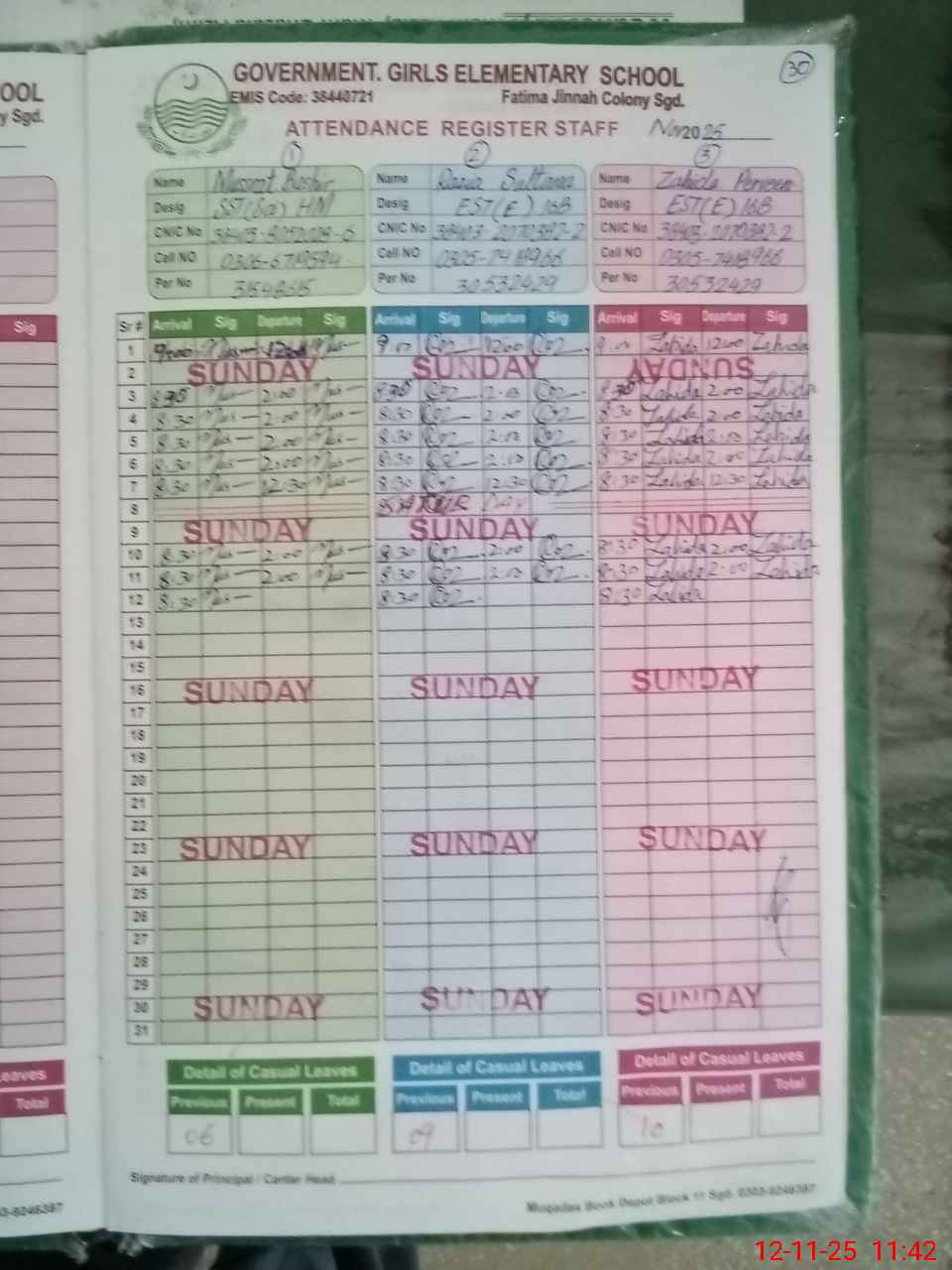 | CNIC | Full Name | Designation | R/C | Absence During Last Calender Month |