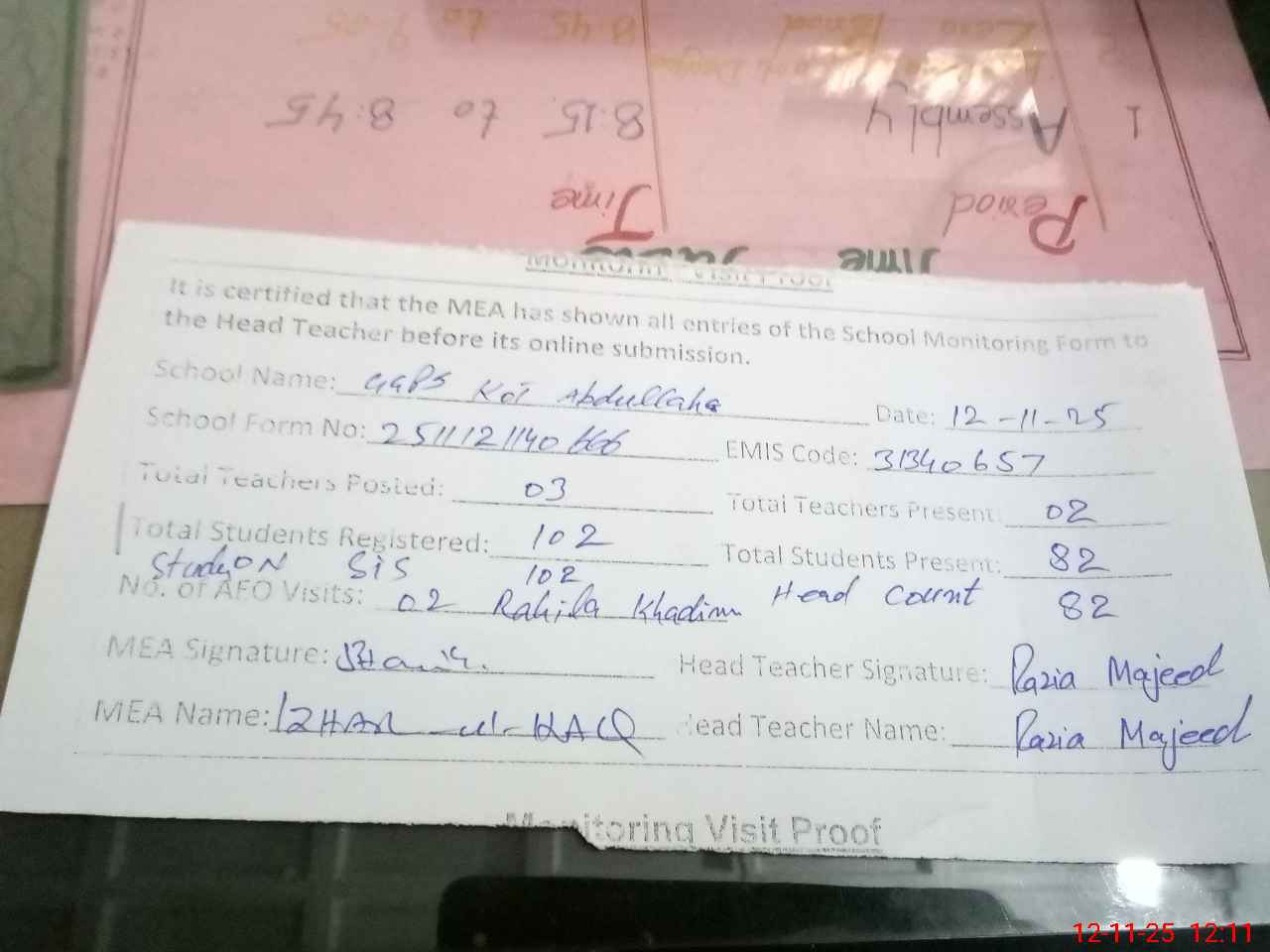 | Monitoring Date: 12-11-2025 | Start Time: 12-11-2025 11:40 AM | End Time: 12-11-2025 12:16 PM | Name of MEA: Mu**** Iz**** UlHa**** | |