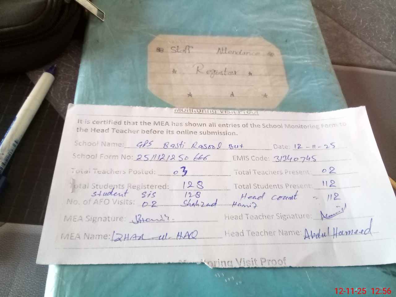 | Attendance Register | Head Teacher | MEA with School | Visit Proof |