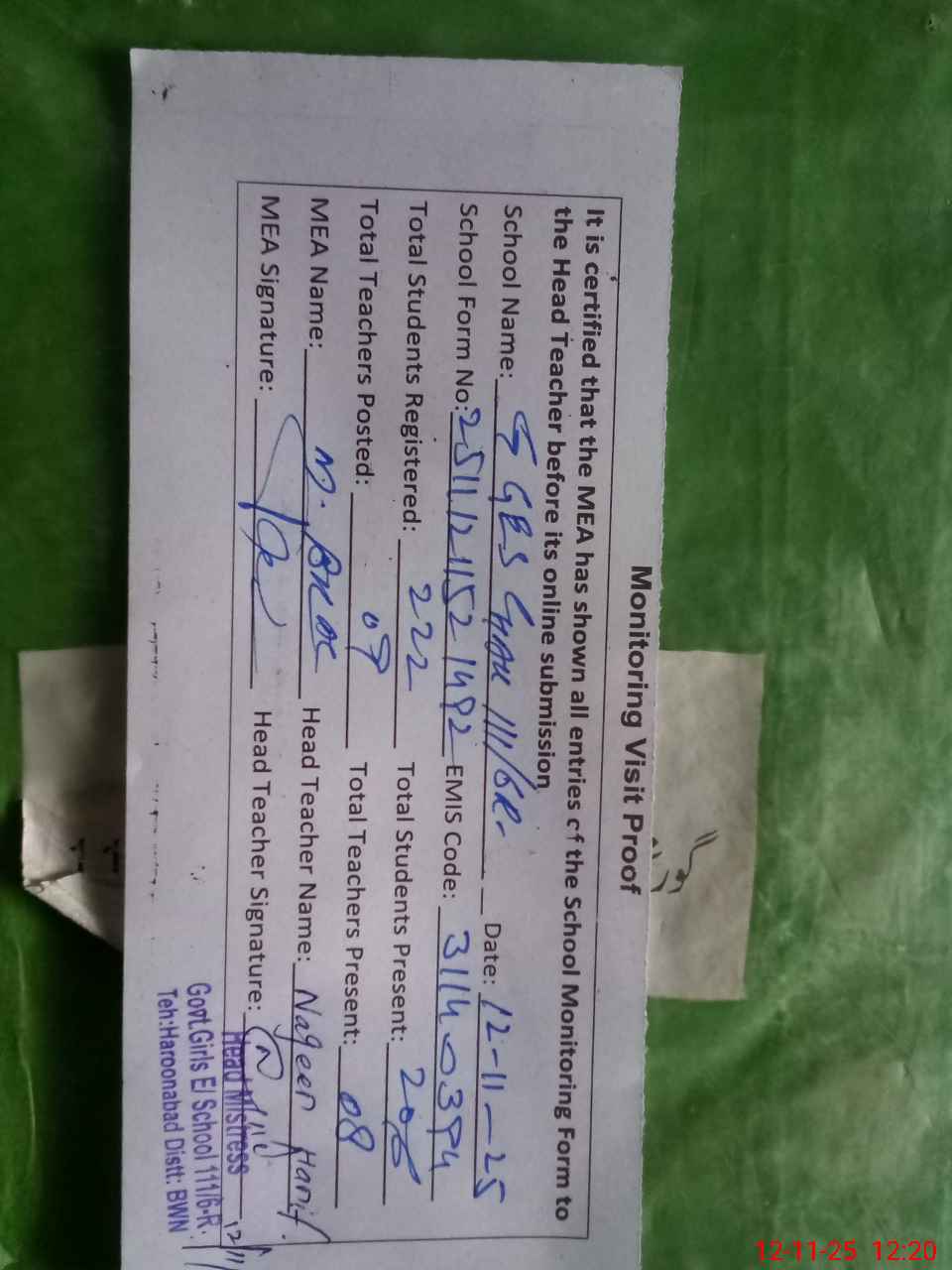 | Attendance Register | Head Teacher | MEA with School | Visit Proof |