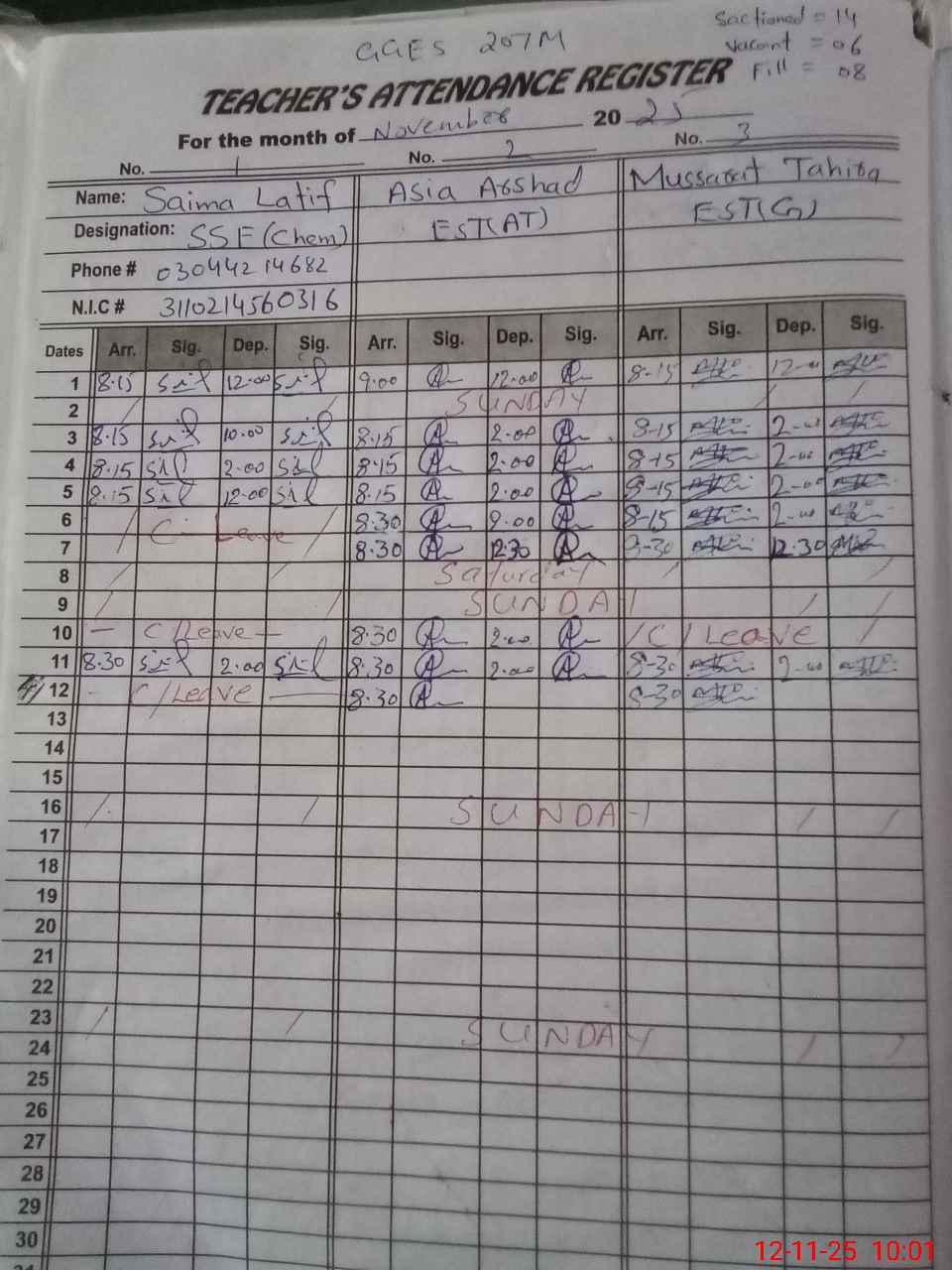 | CNIC | Full Name | Designation | R/C | Absence During Last Calender Month |