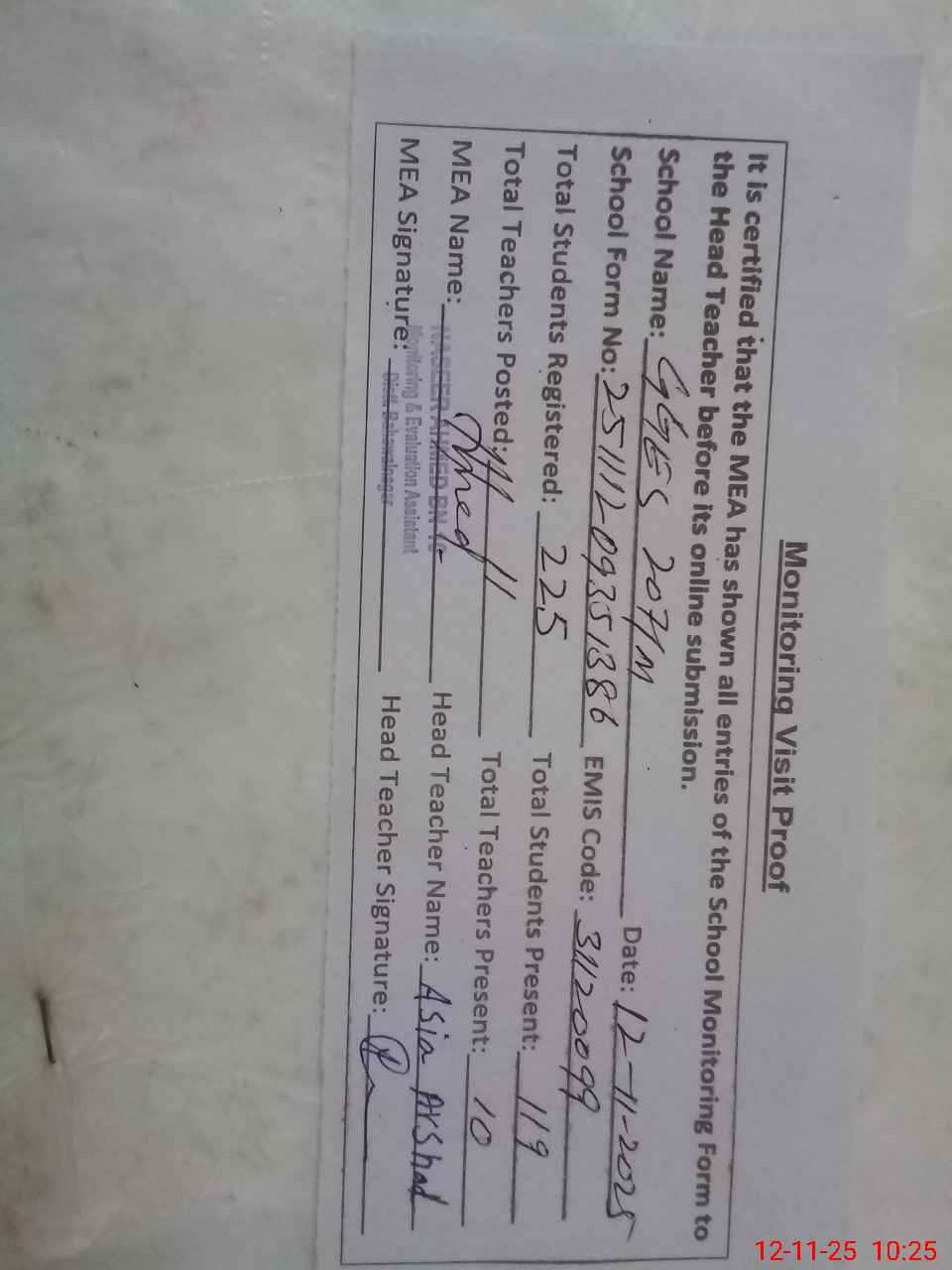 | Attendance Register | Head Teacher | MEA with School | Visit Proof |