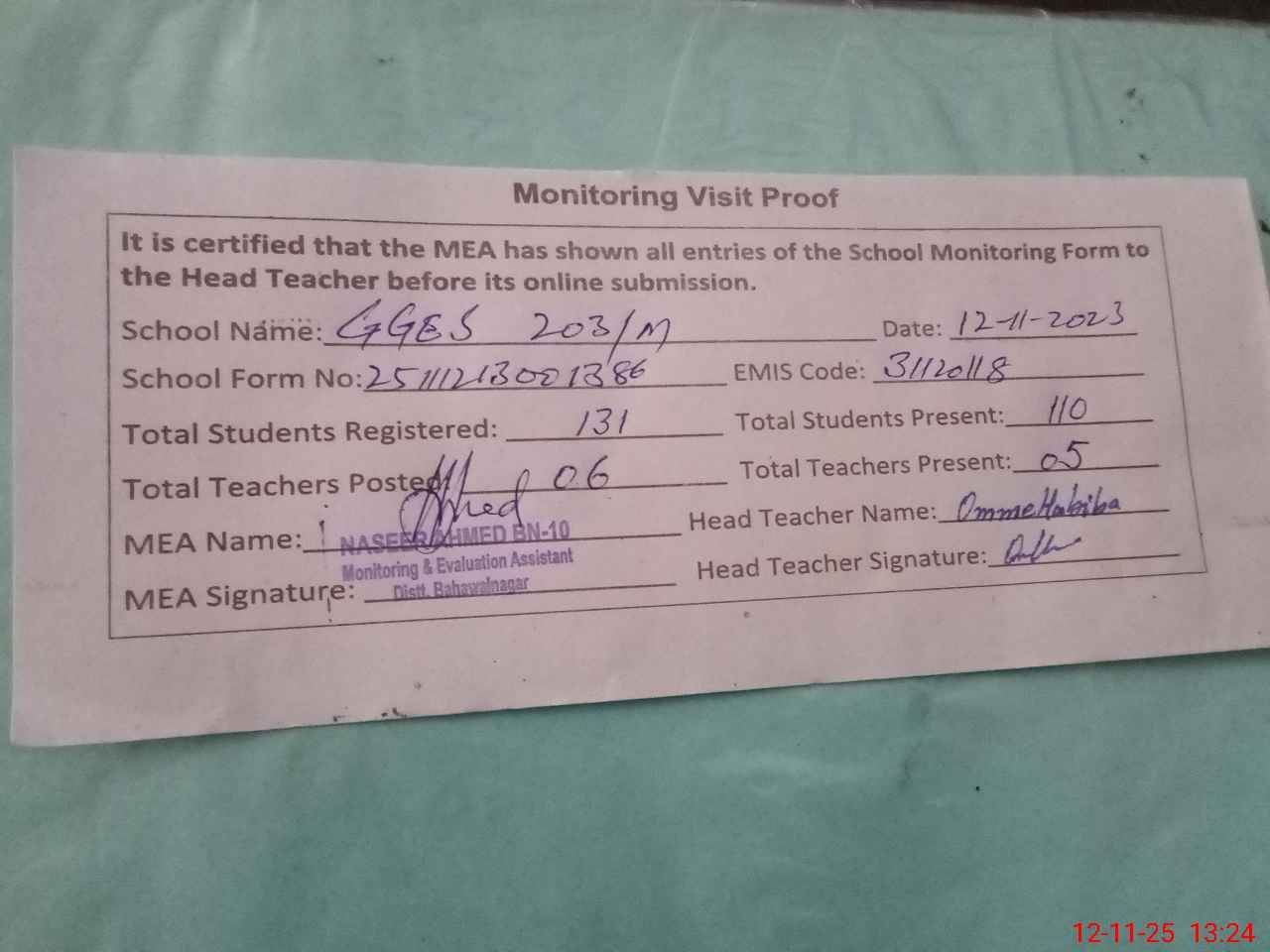 | EMIS Code: 31120118 | Name of School: GGES CHAK NO. 203 M | |||