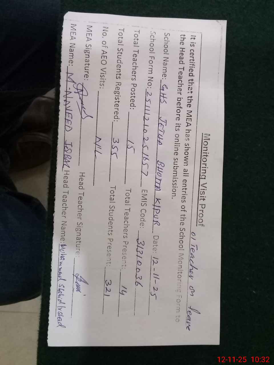 | Attendance Register | Head Teacher | MEA with School | Visit Proof |