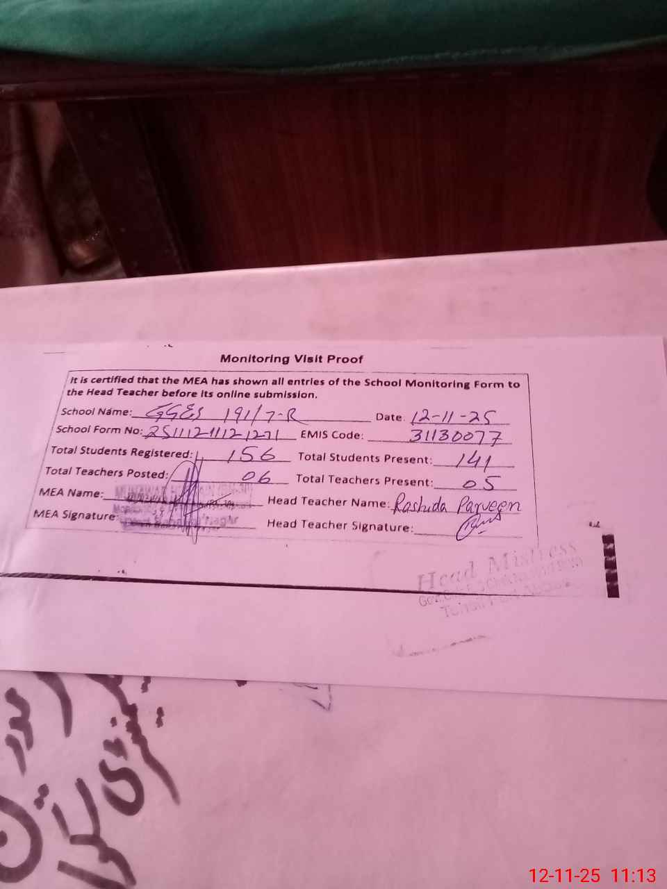 | EMIS Code: 31130077 | Name of School: GGES CHAK NO 191/7-R | |||