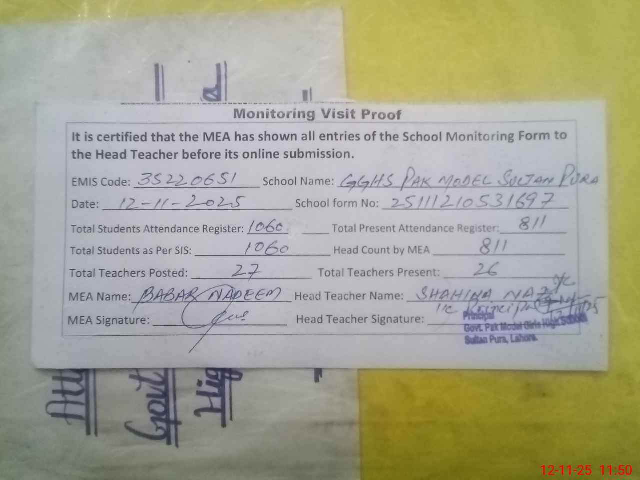 | EMIS Code: 35220651 | Name of School: GGHS PAK MODEL SULTAN PURA | |||