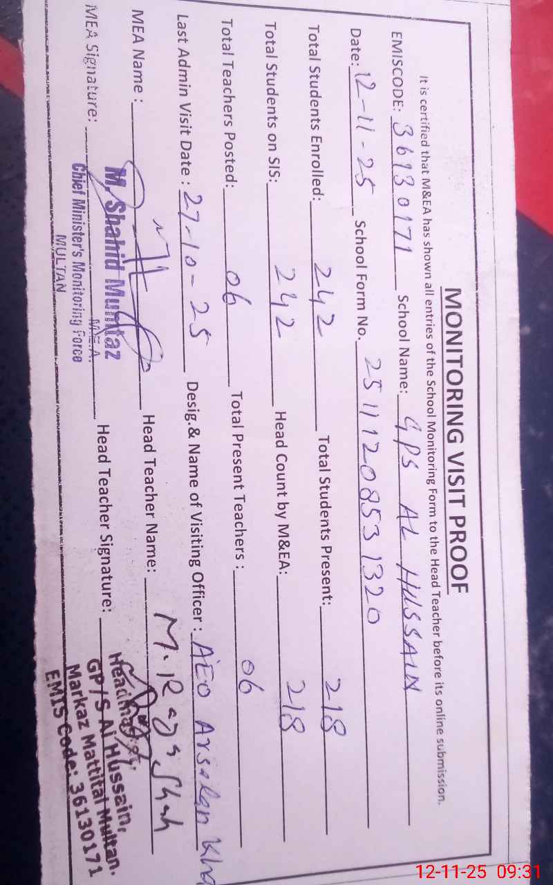 | EMIS Code: 36130171 | Name of School: GPS AL-HUSSAIN (BASTI TABOO WALA MATTI TAL) | |||