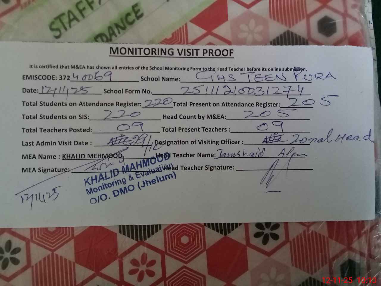 | EMIS Code: 37240069 | Name of School: GHS TEEN PURA | |||