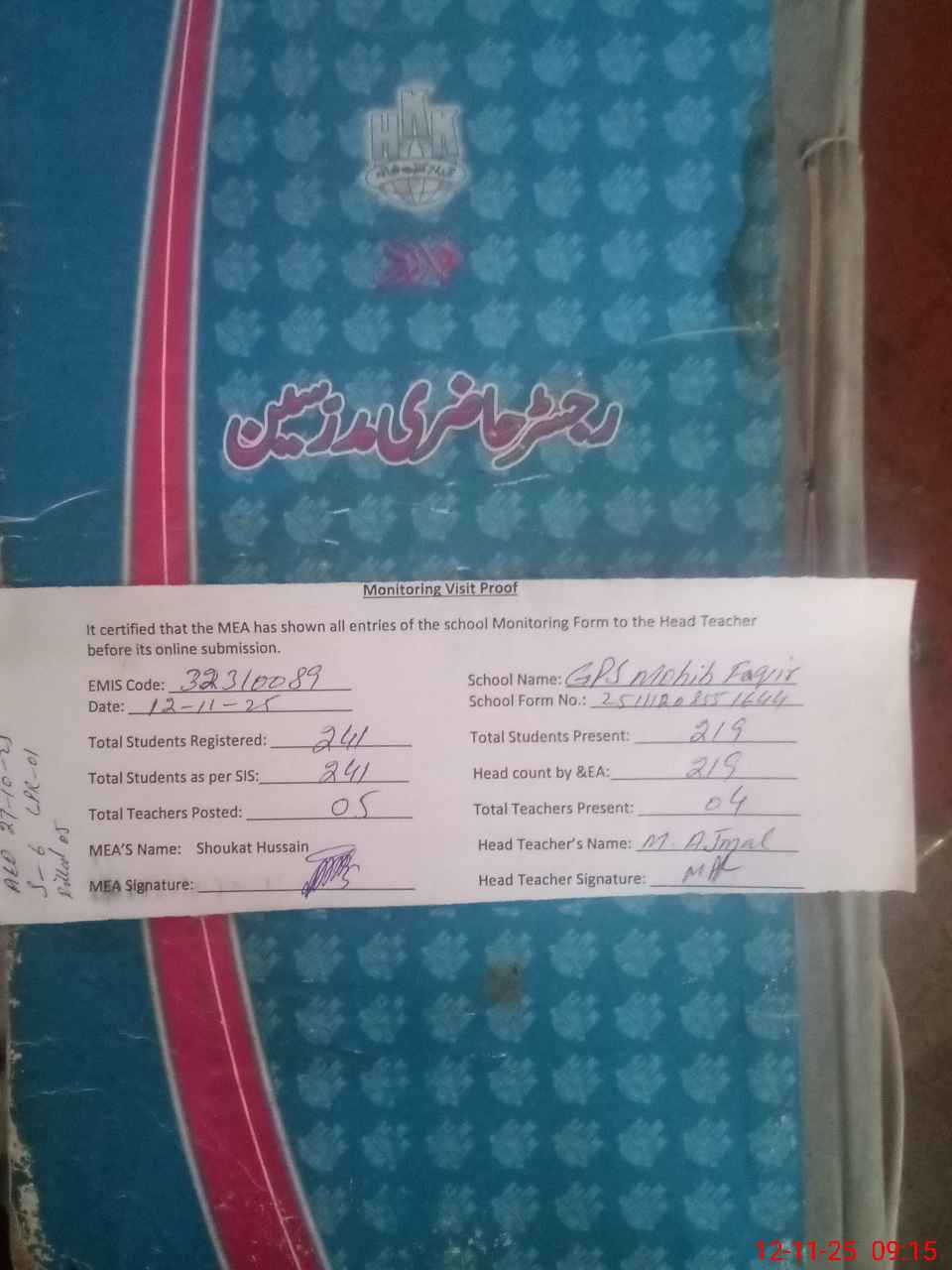 | Attendance Register | Head Teacher | MEA with School | Visit Proof |