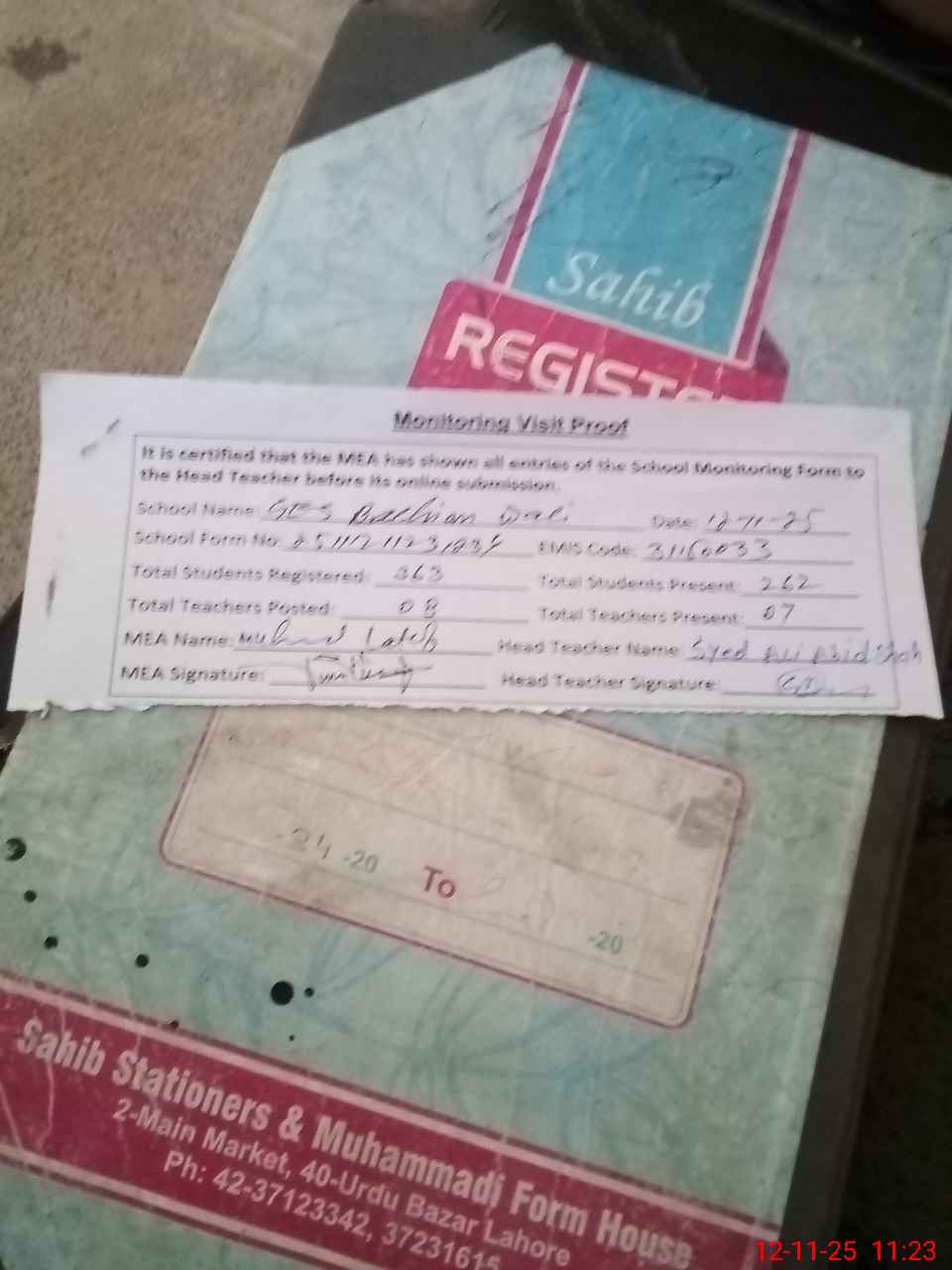 | Attendance Register | Head Teacher | MEA with School | Visit Proof |
