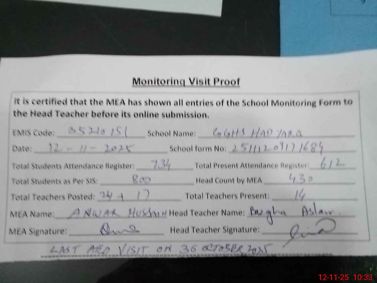 | Attendance Register | Head Teacher | MEA with School | Visit Proof |