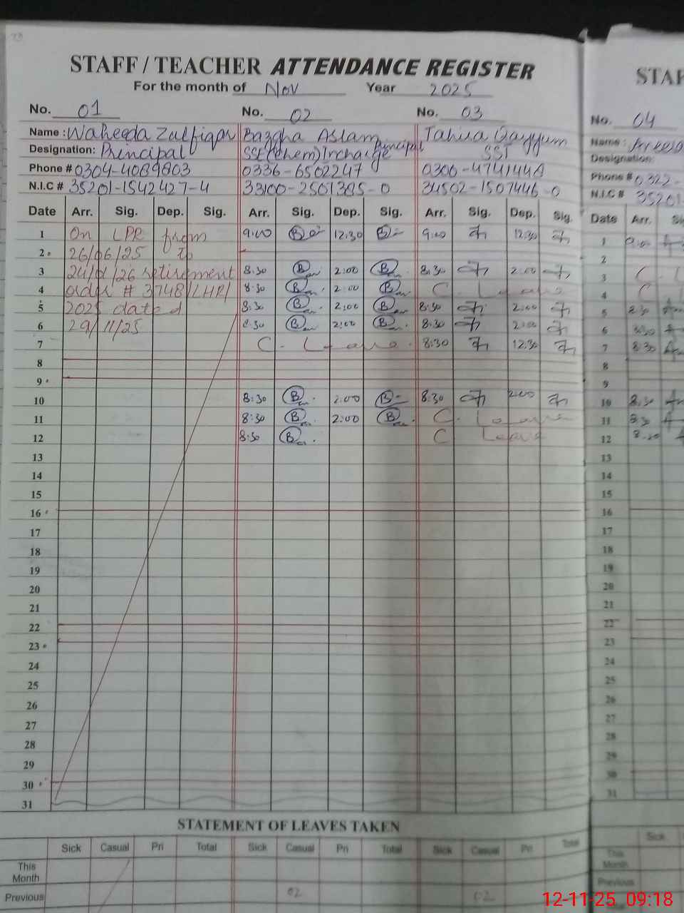 | CNIC | Full Name | Designation | R/C | Absence during last cal. month |