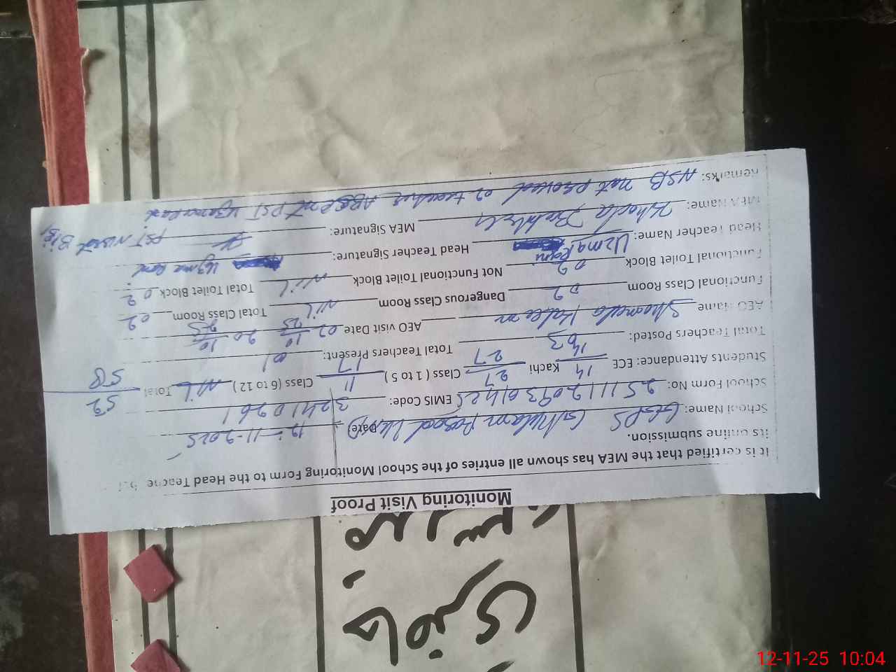 | Remarks (Use Separate Page if Required): Nsb not provide two teachers absent PST Nusrat bi bi PST uzma Rani over all cleanliness good | |||||