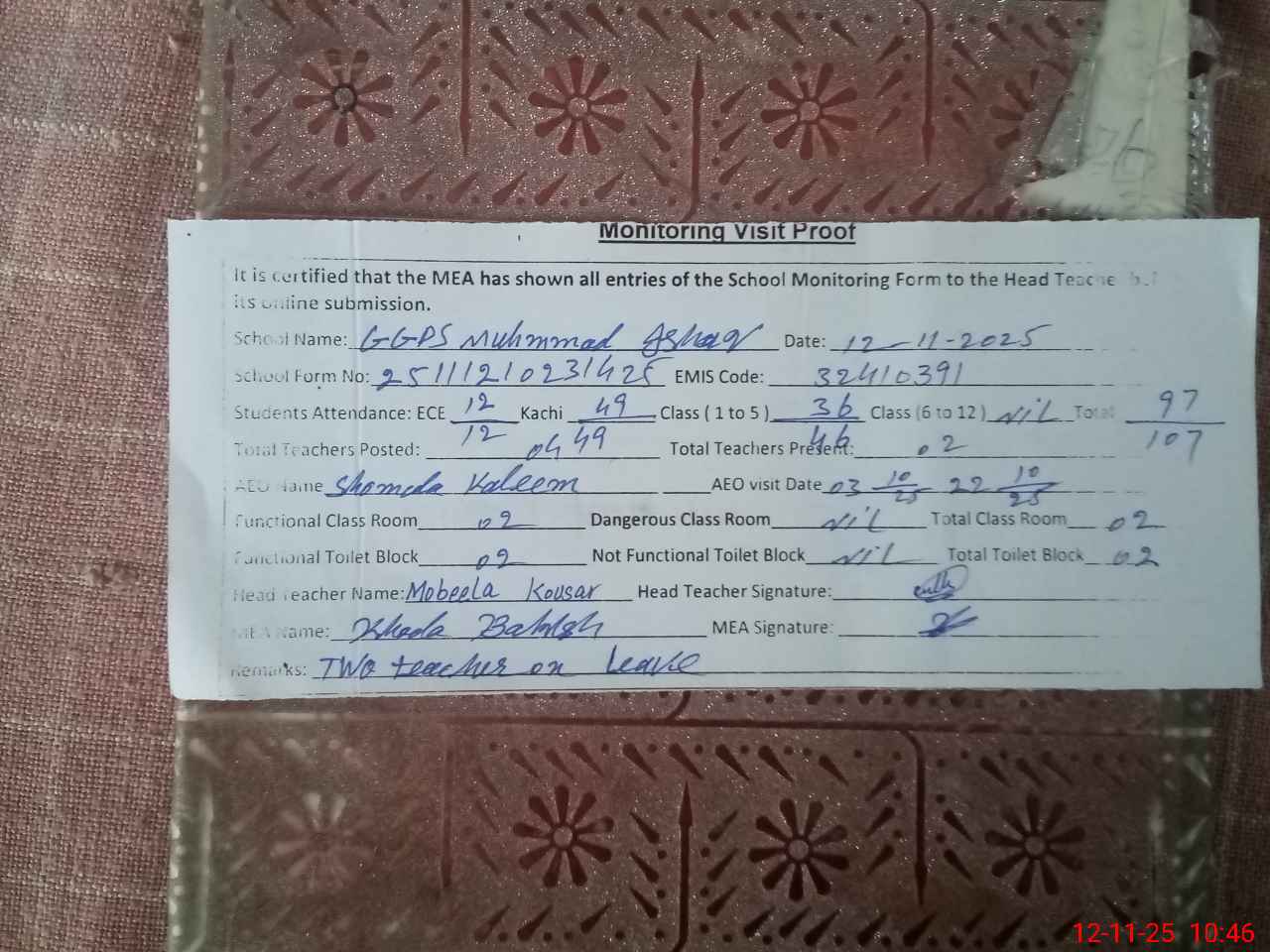 | Remarks (Use Separate Page if Required): Two teachers on leave over all cleanliness good | |||||