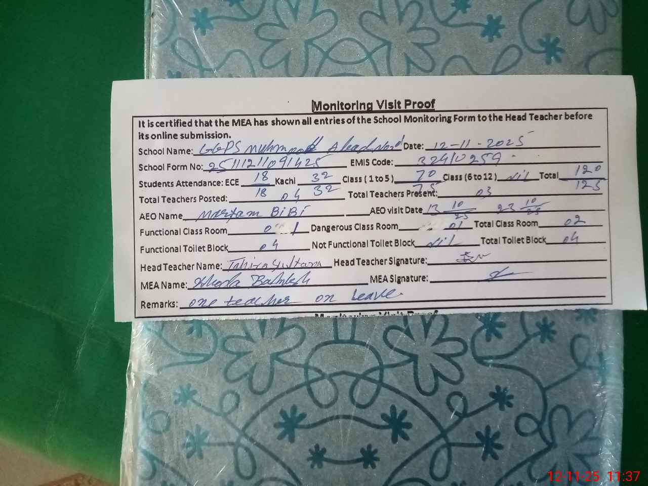 | EMIS Code: 32410259 | Name of School: GGPS MEHMOOD ABAD NO.1 | |||