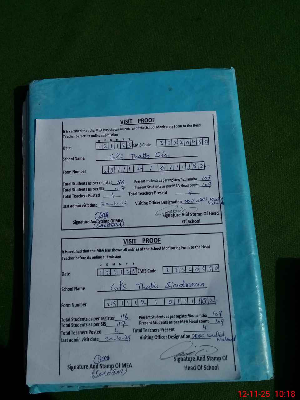 | Attendance Register | Head Teacher | MEA with School | Visit Proof |