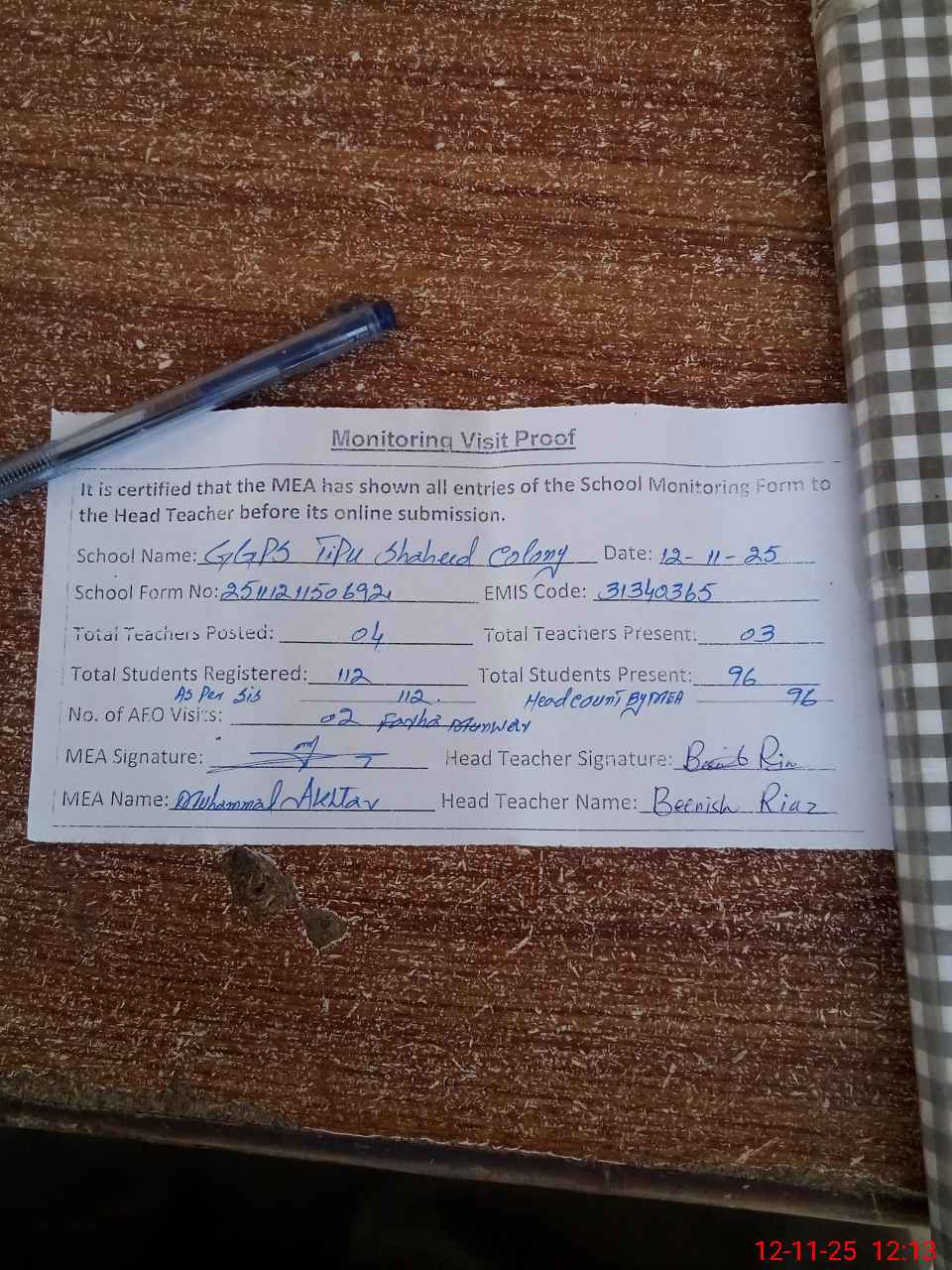 | Attendance Register | Head Teacher | MEA with School | Visit Proof |