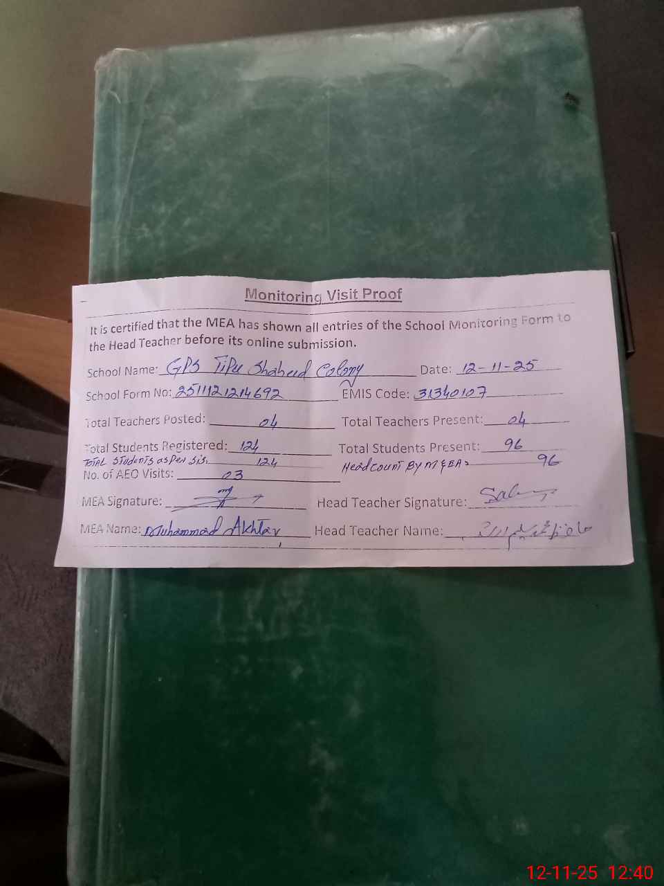 | Attendance Register | Head Teacher | MEA with School | Visit Proof |