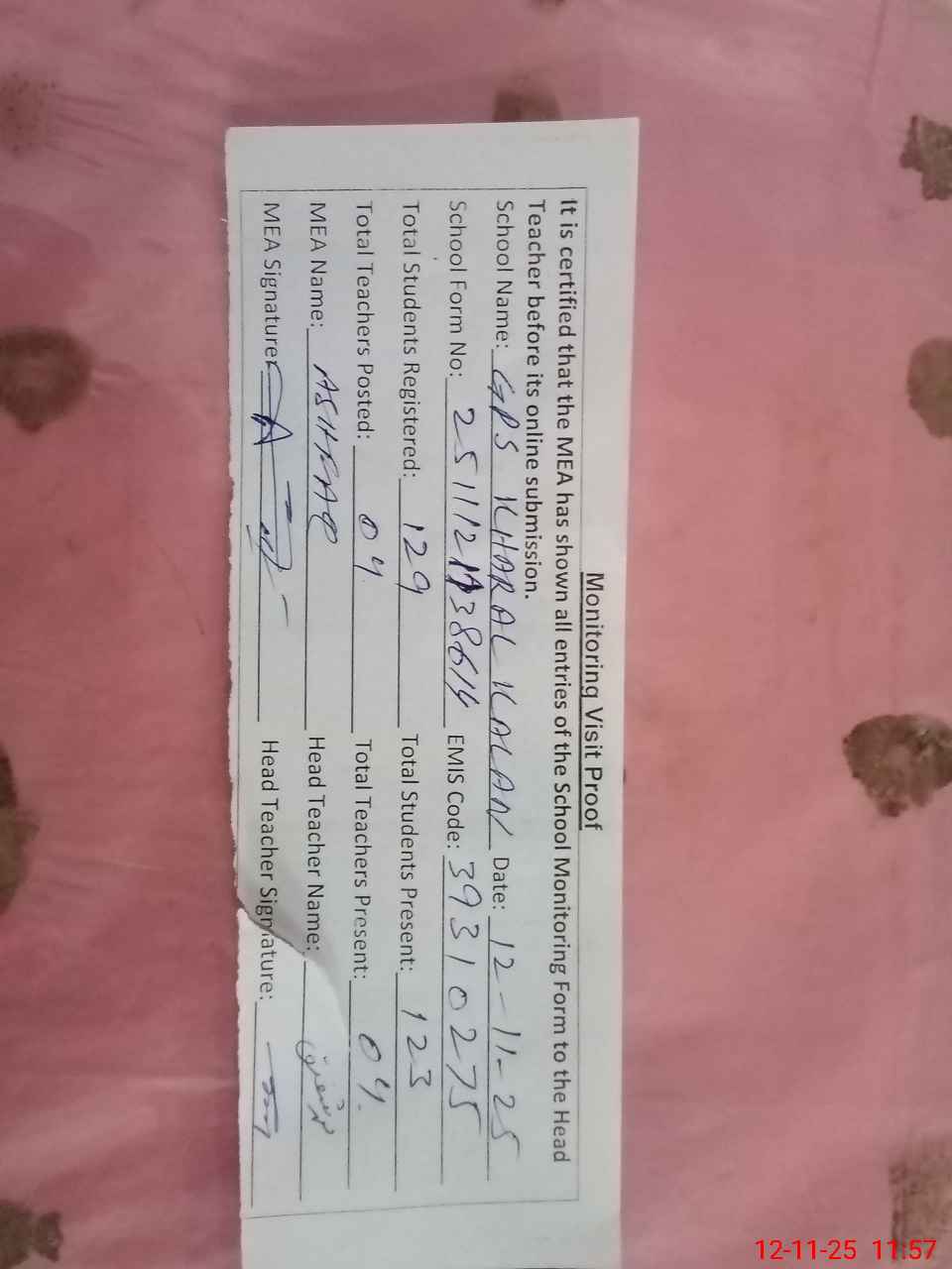 | Attendance Register | Head Teacher | MEA with School | Visit Proof |