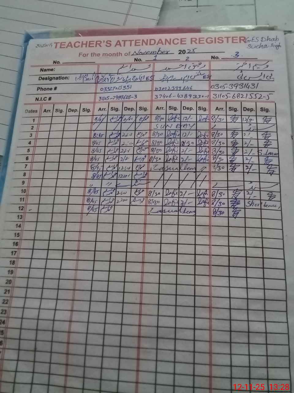 | Remarks (Use Separate Page if Required): PST Muhammad Naeem CNIC 3110576717727 absent from school since long dated 25 September 2024 with out any official proof | |||||