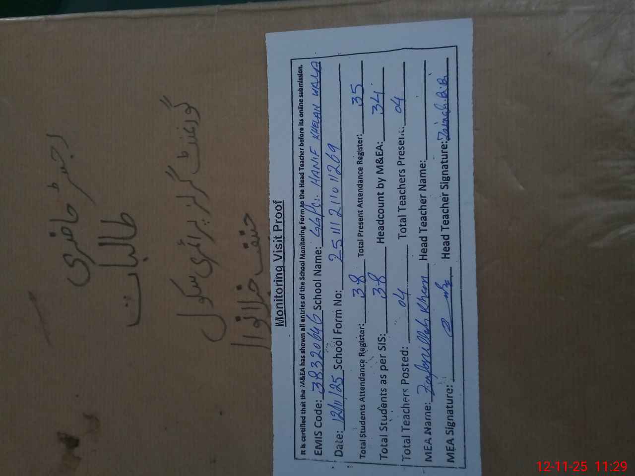 | Attendance Register | Head Teacher | MEA with School | Visit Proof |
