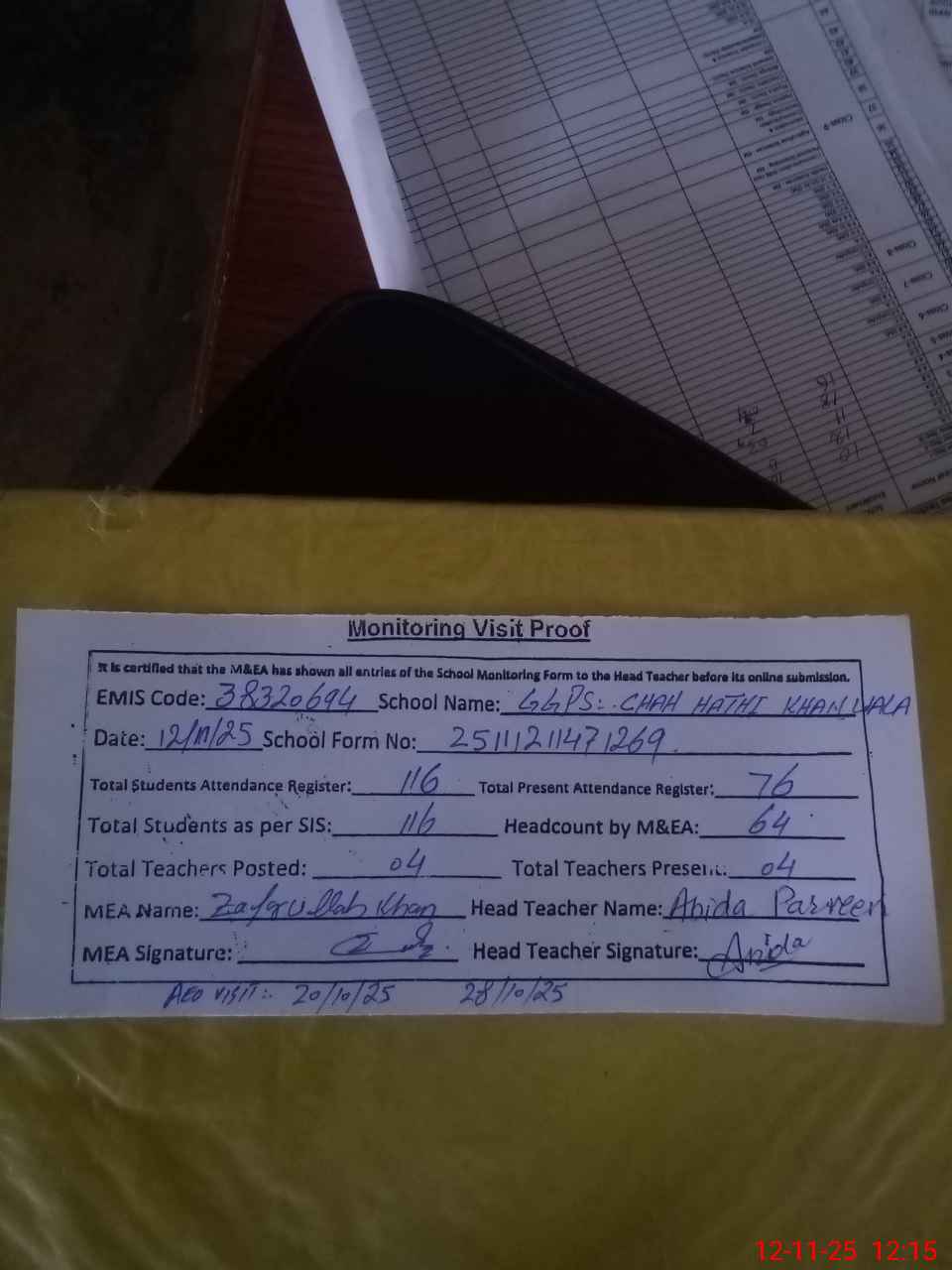 | Attendance Register | Head Teacher | MEA with School | Visit Proof |