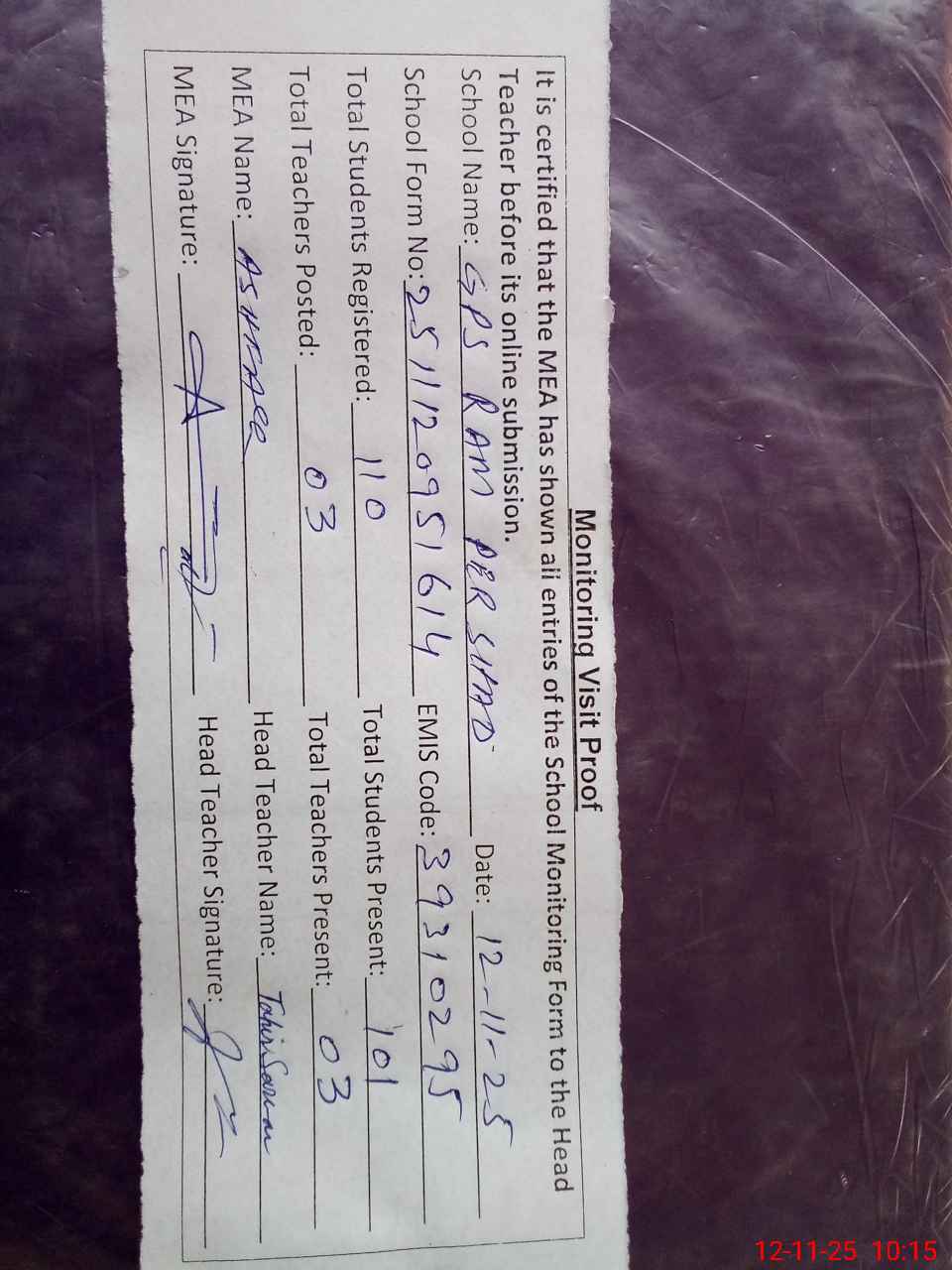 | Attendance Register | Head Teacher | MEA with School | Visit Proof |