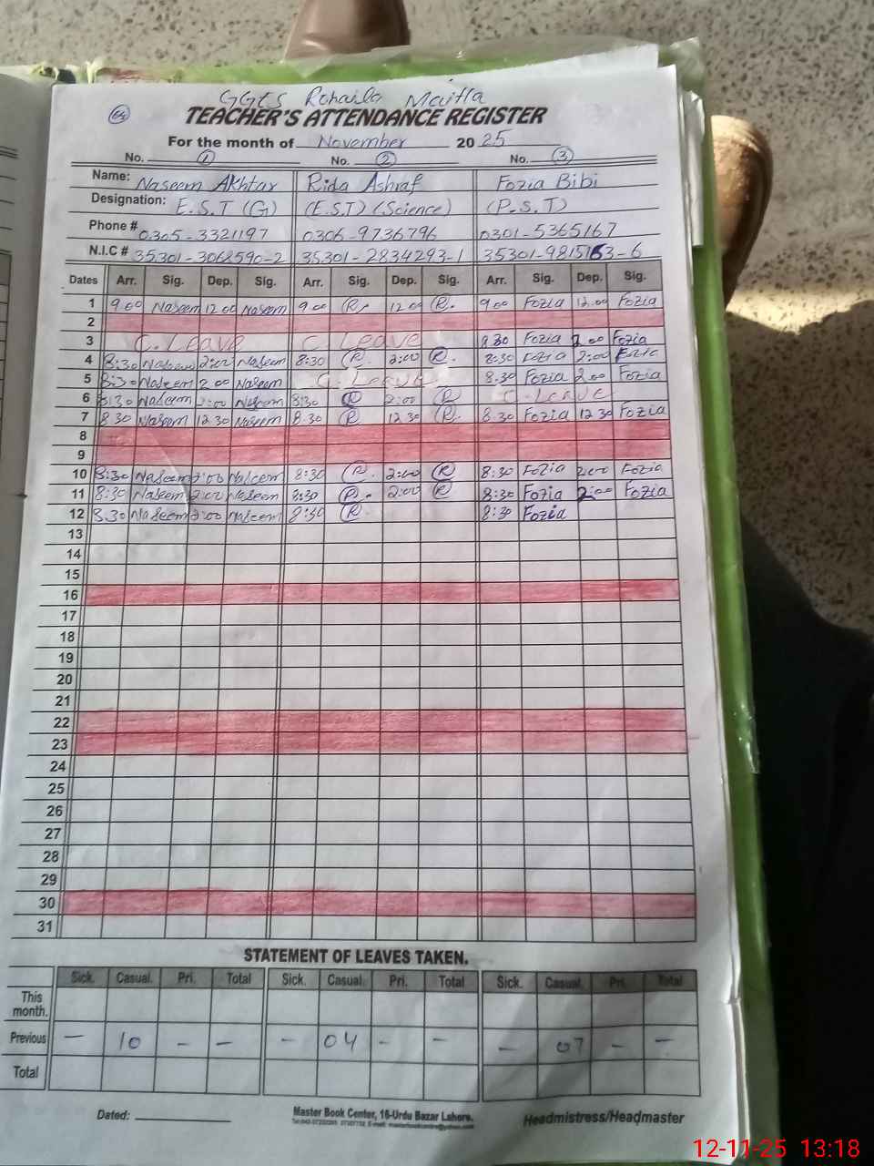| CNIC | Full Name | Designation | R/C | Absence During Last Calender Month |
