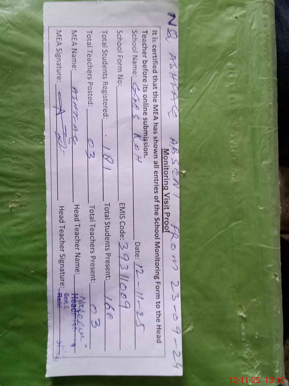 | Attendance Register | Head Teacher | MEA with School | Visit Proof |