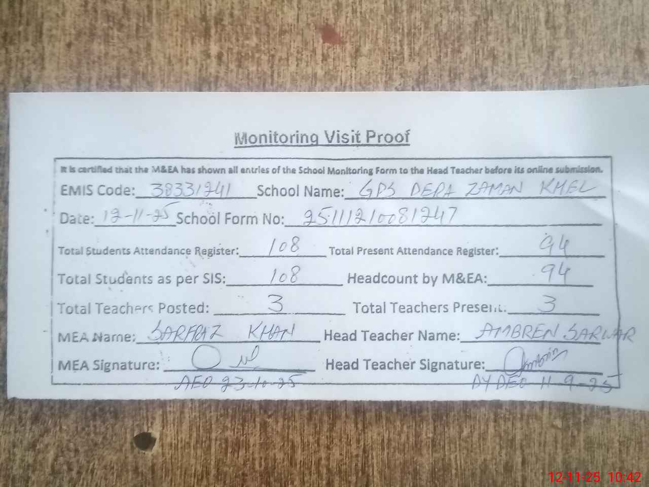 | EMIS Code: 38331241 | Name of School: GPS DERA ZAMAN KHEL PO CHASHMA BERAJ COLONY | |||
