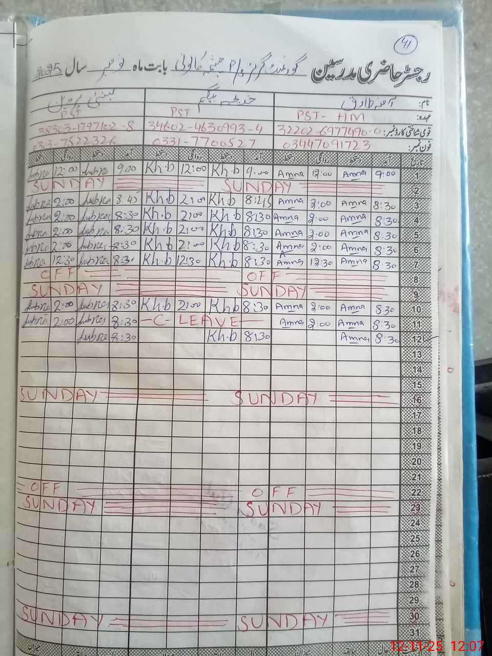 | CNIC | Full Name | Designation | R/C | Absence During Last Calender Month |