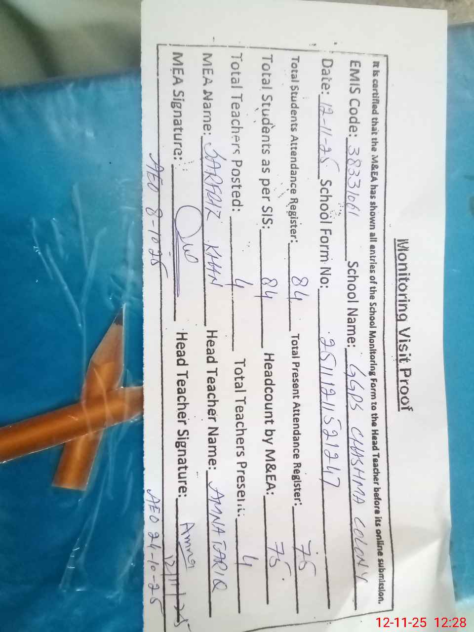 | Attendance Register | Head Teacher | MEA with School | Visit Proof |