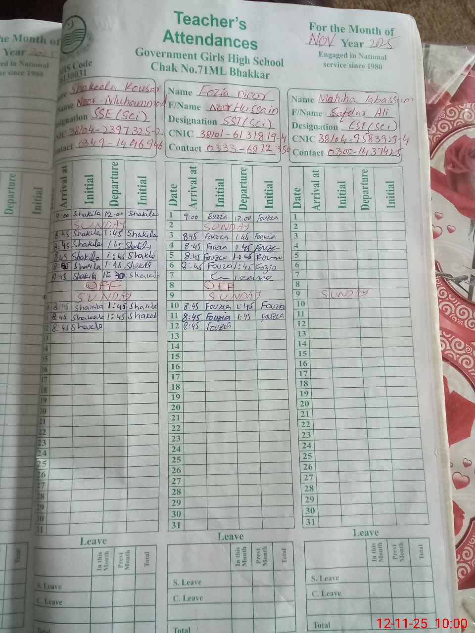 | CNIC | Full Name | Designation | R/C | Absence during last cal. month |