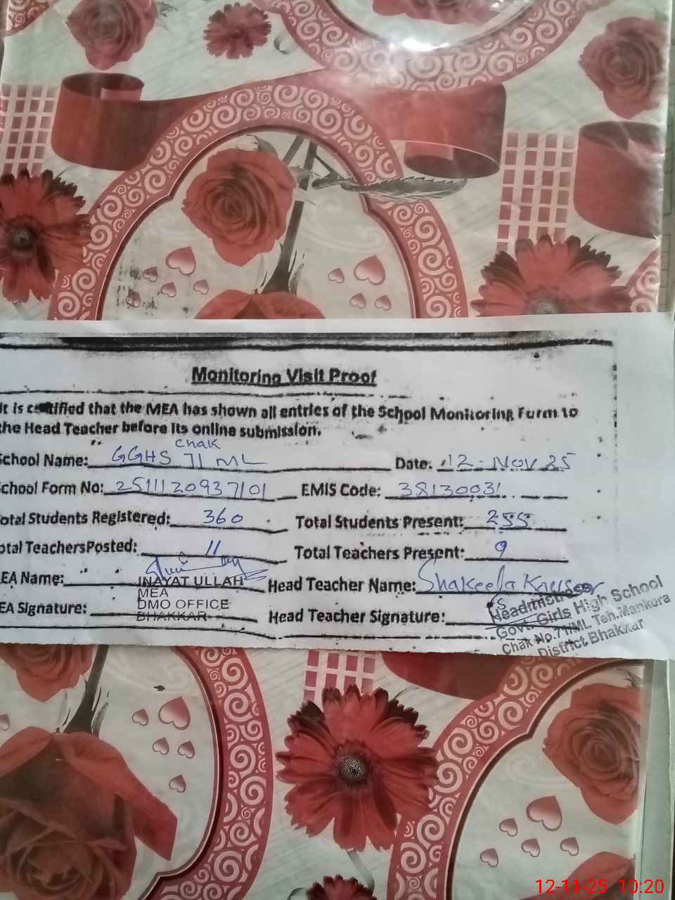 | Attendance Register | Head Teacher | MEA with School | Visit Proof |