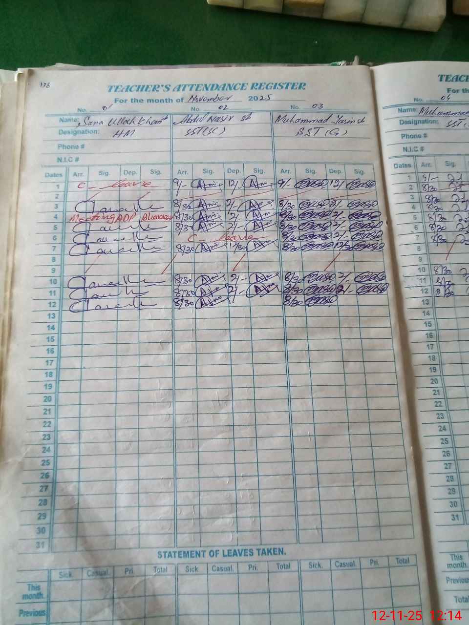 | CNIC | Full Name | Designation | R/C | Absence During Last Calender Month |