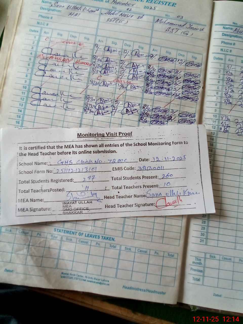 | Attendance Register | Head Teacher | MEA with School | Visit Proof |