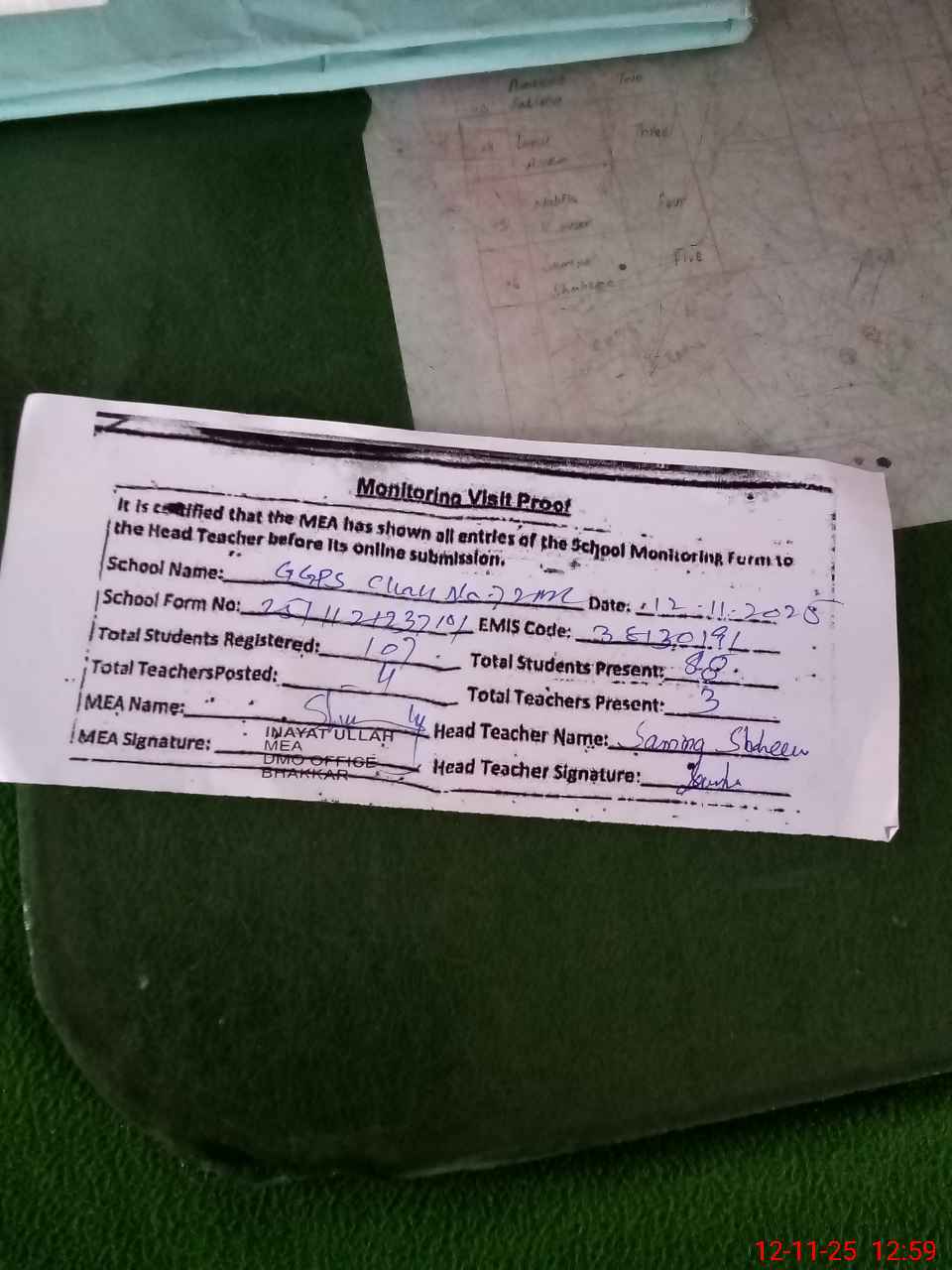 | Certified that this School was Inspected by the Undersigned MEA/DMO Today and the Information Stated Above is as Per Record. | |||||