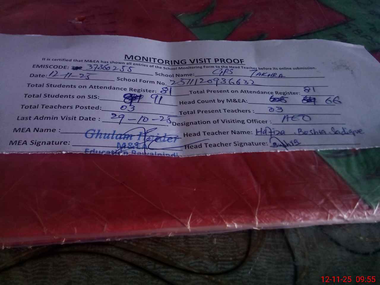 | Attendance Register | Head Teacher | MEA with School | Visit Proof |