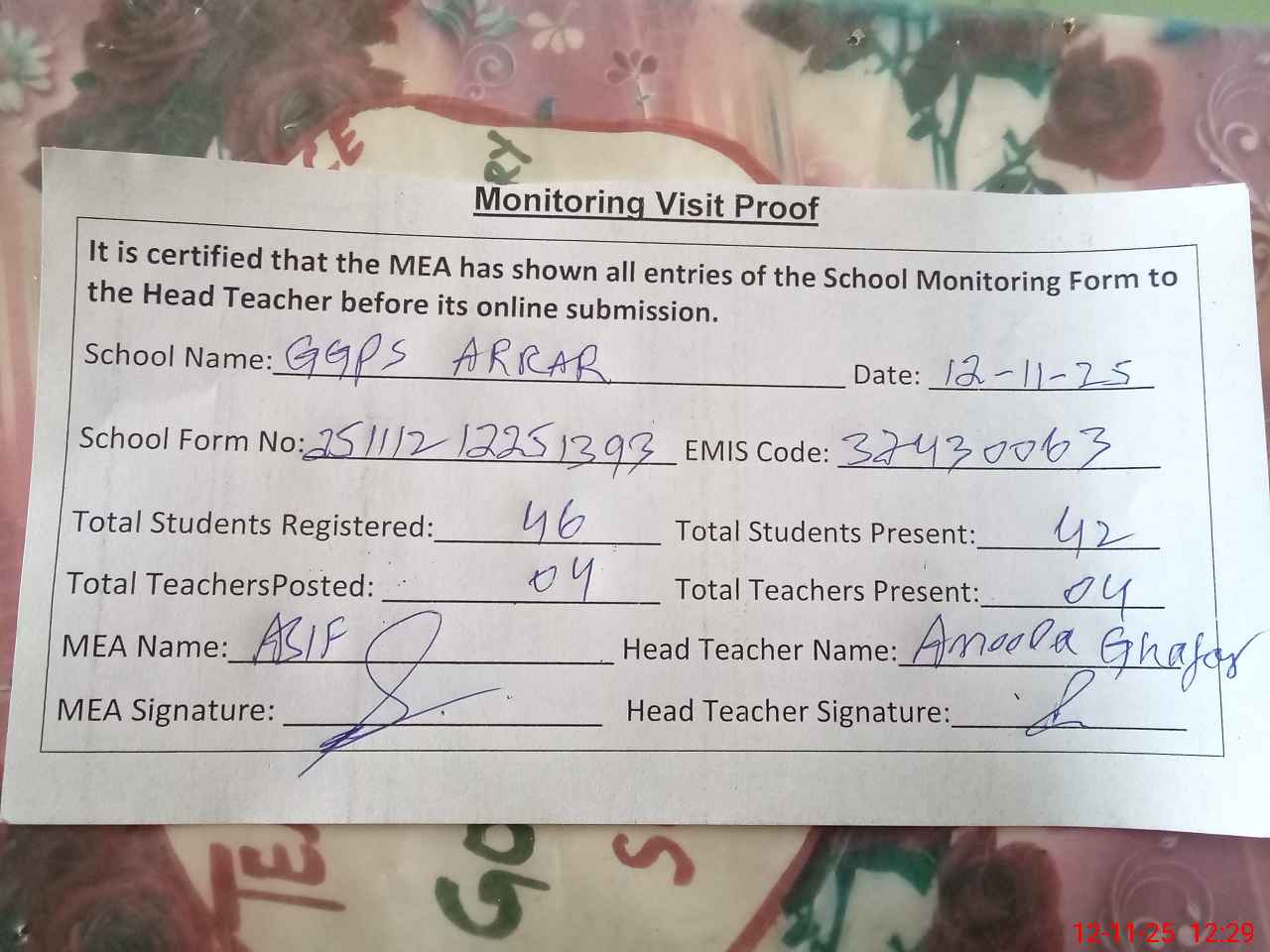 | Attendance Register | Head Teacher | MEA with School | Visit Proof |