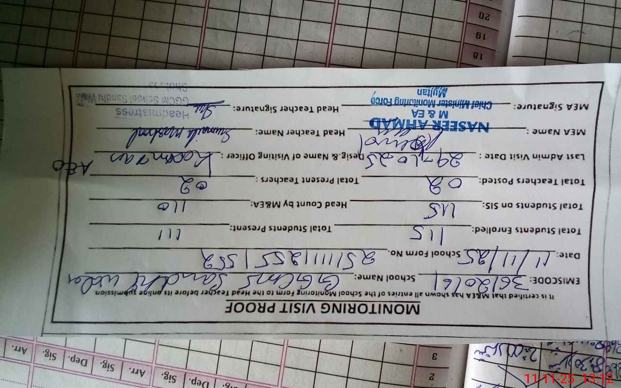 | Attendance Register | Head Teacher | MEA with School | Visit Proof |