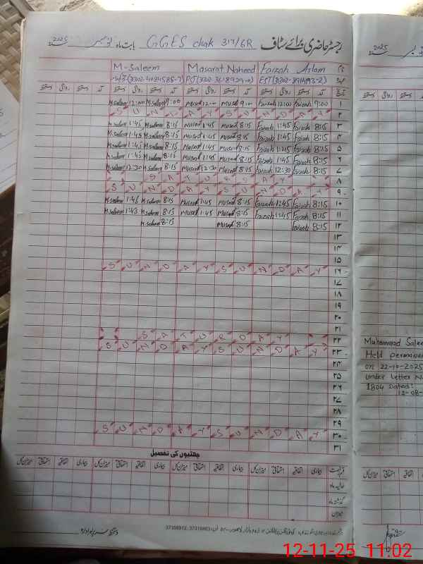 | CNIC | Full Name | Designation | R/C | Absence During Last Calender Month |
