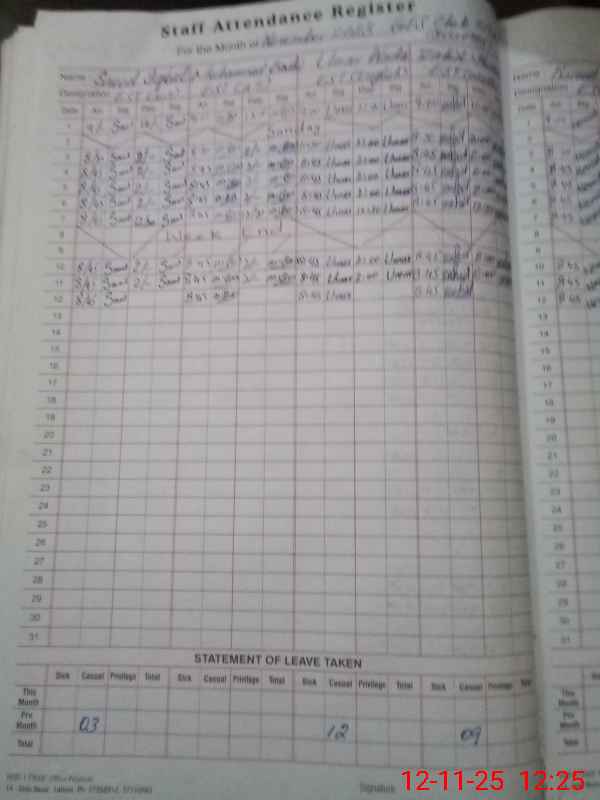 | CNIC | Full Name | Designation | R/C | Absence During Last Calender Month |