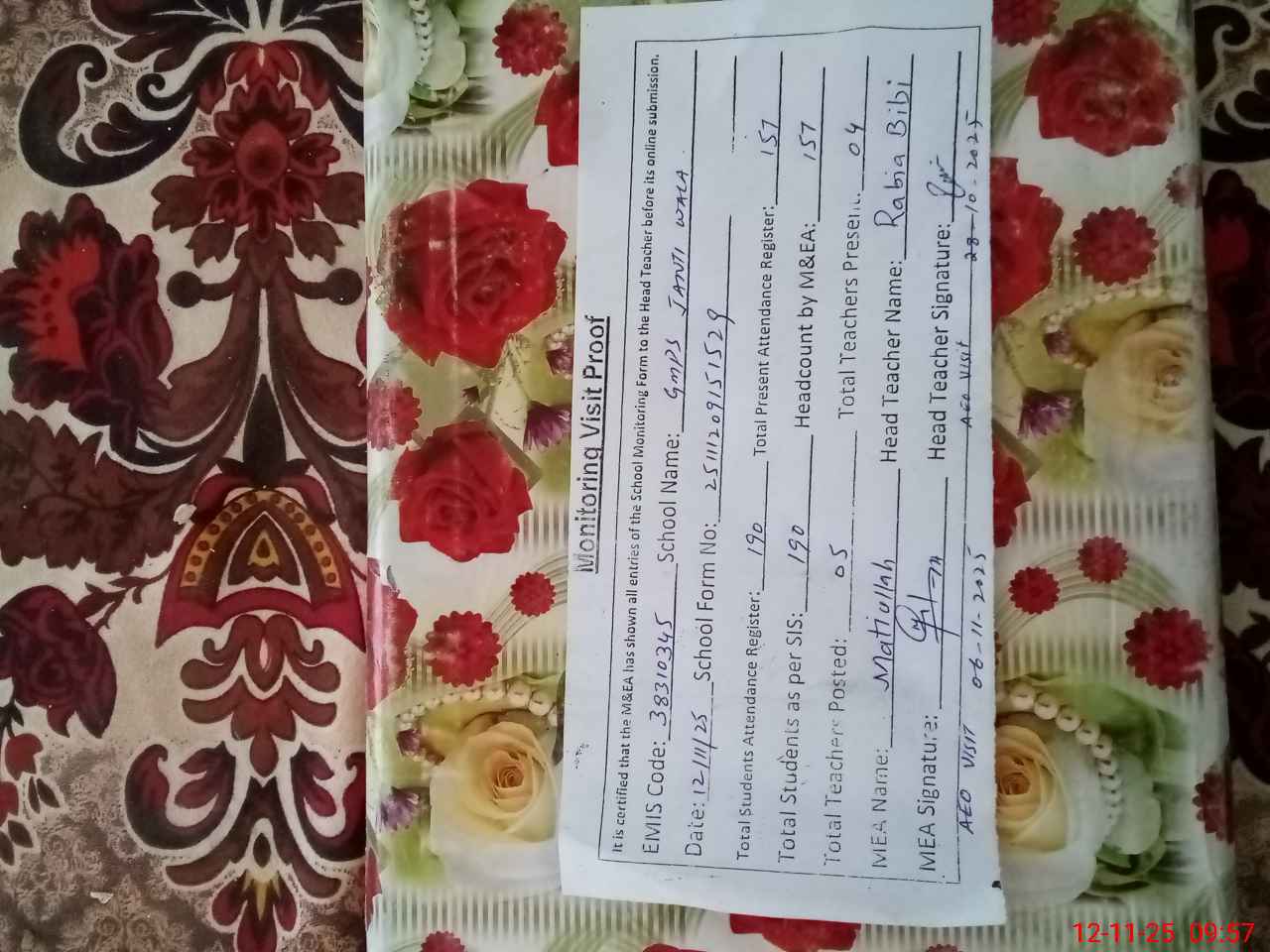| Attendance Register | Head Teacher | MEA with School | Visit Proof |