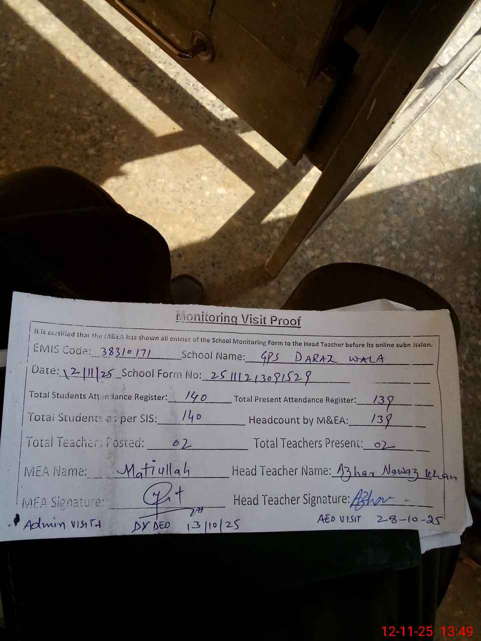 | Attendance Register | Head Teacher | MEA with School | Visit Proof |