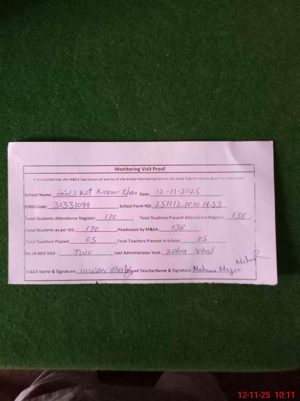 | Attendance Register | Head Teacher | MEA with School | Visit Proof |