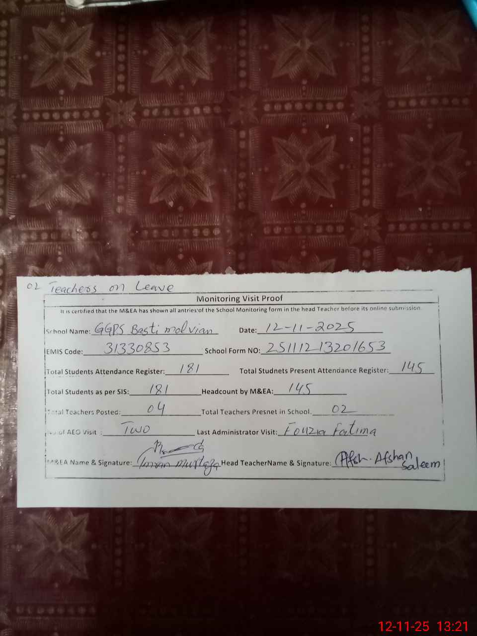 | Attendance Register | Head Teacher | MEA with School | Visit Proof |